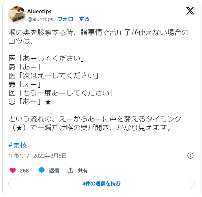 私はあんまり喉の奥を覗くことはないのですが、研修医時代は確かに苦労しました。いくら喉を見せてと言っても口が開かない人もいれば、開いたと思っても奥が見えない人がたくさんいました。舌圧子で押さえつけると咳き込んで飛沫を浴びますし、よくあんな環境で発熱対応していたなぁと思います。