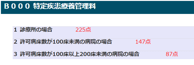B000 特定疾患療養管理料 1 診療所の場合 225点 2 許可病床数が100床未満の病院の場合 147点 3 許可病床数が100床以上200床未満の病院の場合 87点 注 1 別に厚生労働大臣が定...