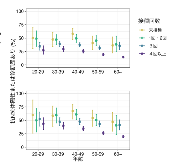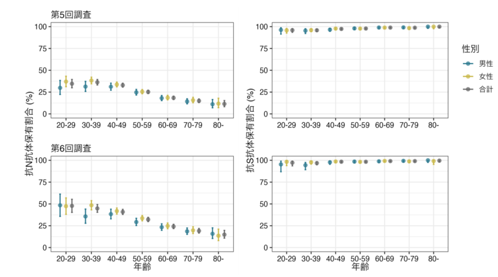 S抗体は表面のスパイクタンパクのことです。ワクチンを打つとこのスパイク蛋白を自分でつくり、それに抗原反応を示して免疫をつくっているわけですが、若者でも90%以上の割合で接種しているのはすごいですね。2023年2月の調査ですのでワクチン接種からは1年以上たっているはずです。若者だけすこし下がってきているのはやはり3回目以降を打った人がすくないからでしょうか?一方N抗体は核に対する抗体です。これは感染しない限り陽性にはなりません。