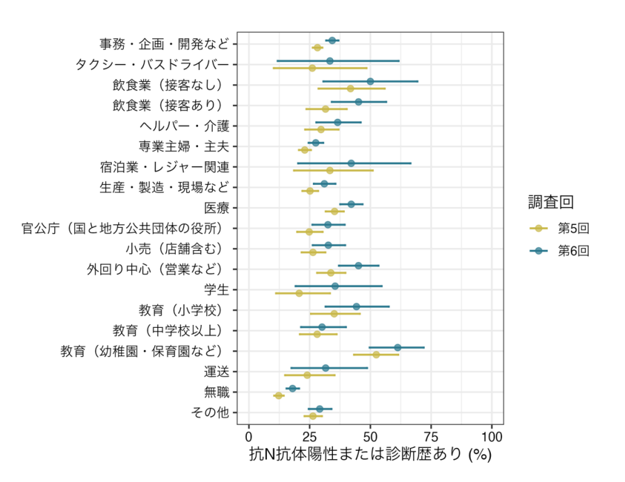 職種別では保育園幼稚園の職員の感染歴がすごいです。ほかは結構ブレがあるのでわかりにくいですね。介護職、医療職などは過剰診断されているかとおもったのですがそうでもない様子。