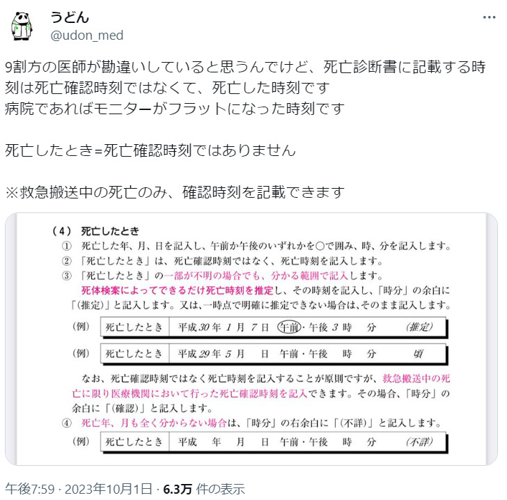 死亡診断書に記載するのは死亡した時間、とのことですが死亡した時間というのはつまり医師が死亡確認した時間ということになってしまいます。死亡確認時間と死亡した時間が違うというならだれが死亡を確認したとなるんでしょうか。