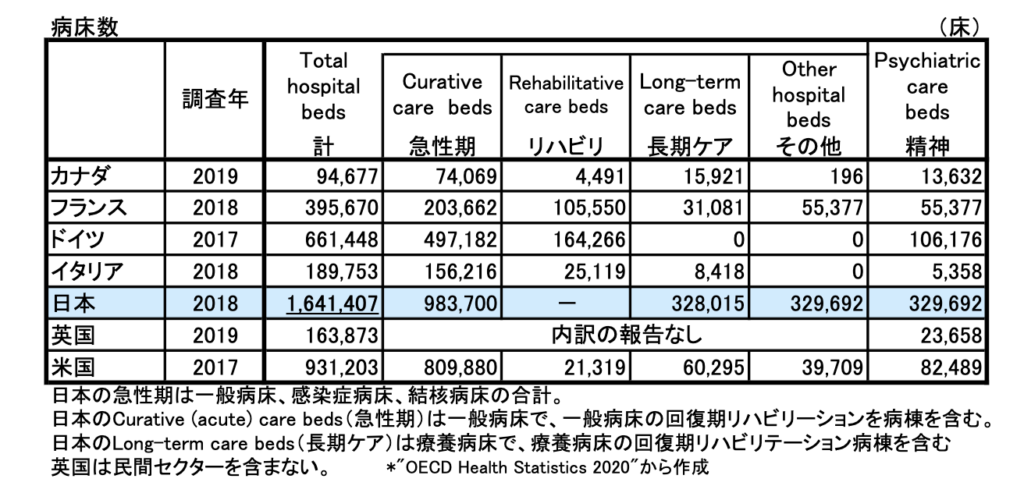 もともと日本の病床数は多いことで有名。特になんちゃって急性期と精神科が多いですね。精神科については下手に減らすとその患者をどこでみるのかという問題があるのであまり減らさないほうがいいでしょう。日本では精神科に入院している人が他国ではホームレスをしていたりするのです。