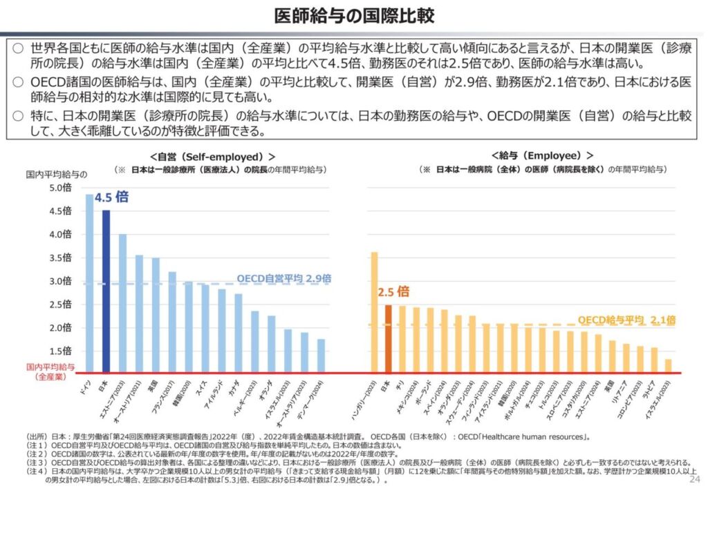 💰 開業医の給与水準が高い:日本の開業医は勤務医やOECD諸国の開業医に比べて給与が大きく乖離。診療所報酬の適正化を主張。