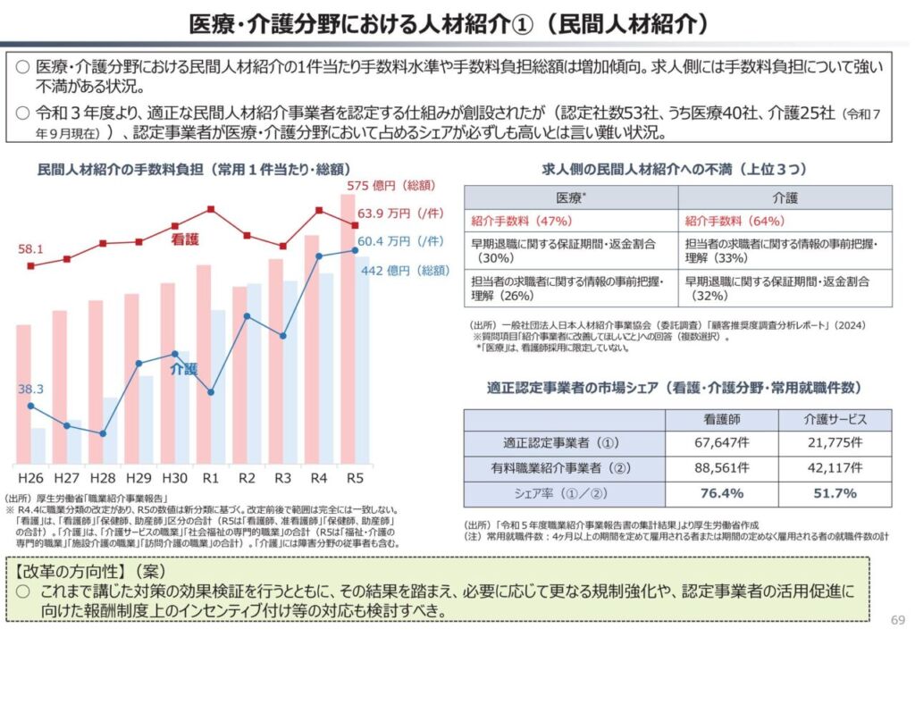 💼 医療・介護人材紹介の規制強化:民間手数料が経営圧迫しないよう規制や報酬制度の見直し、ハローワークの機能強化も提案。