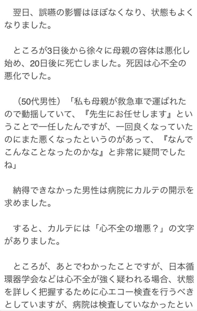 今ある情報だけで医療従事者がこの事件を見たらまたいつもの死体換金かという感想になってしまいます。90代で窒息している時点で相当弱っている人のはずです。もともと心不全もあるでしょう。90歳で心不全がない人なんていません。そういう人が入院する時点で心不全が増悪するリスクはあるわけです。そして窒息のようなイベントがあると一気に悪くなる。